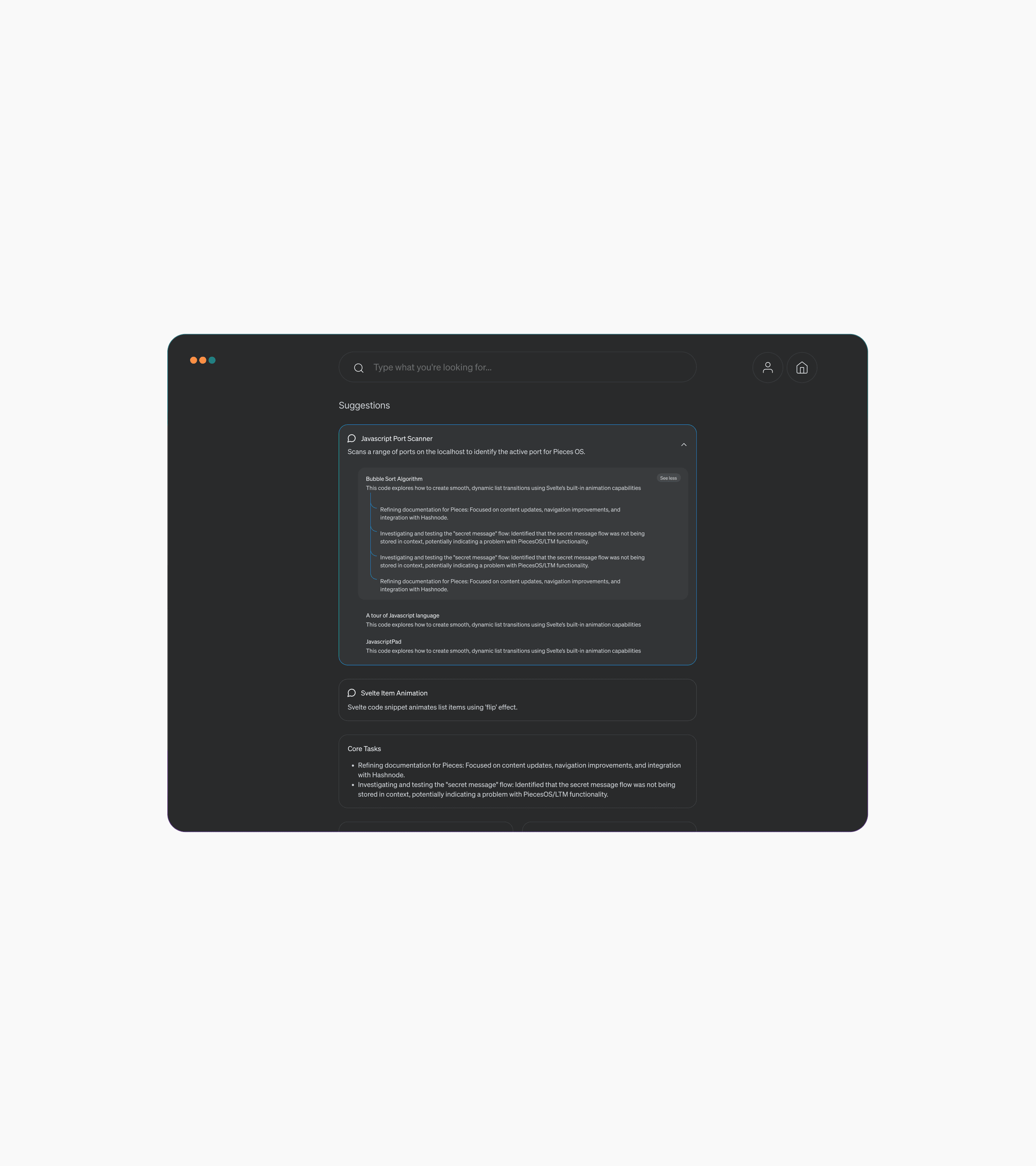 Pieces had two distinct search functionalities—Saved Materials Search and Global Search—each serving different purposes but ultimately creating friction and confusion for users. As adoption grew and our users’ workflows became more sophisticated, it became clear that this bifurcated experience was holding us back from delivering the clarity and utility developers needed.