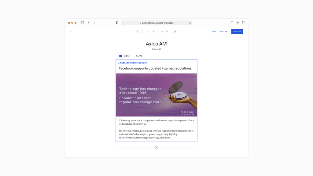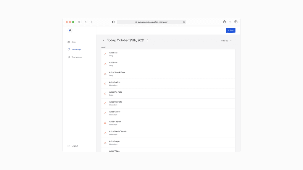 As Axios increased their newsletter portfolio, it was crucial to create a less manual and more streamlined way to place and schedule ad creatives as well as quality assure them. The Ad Ops and CS teams used Google Analytics in order to set-up all Newsletter ads. The workflow by which Ad Ops traffics ads to email newsletters was unsustainable and unscalable.