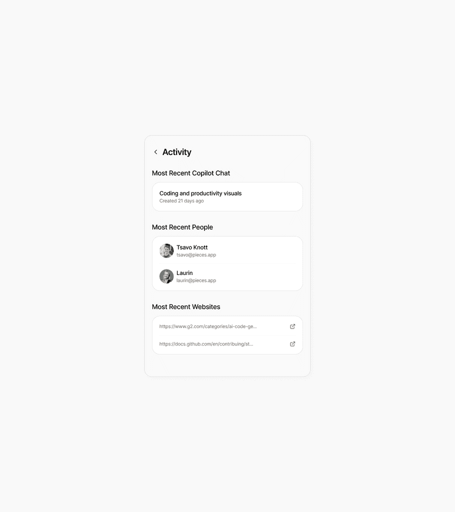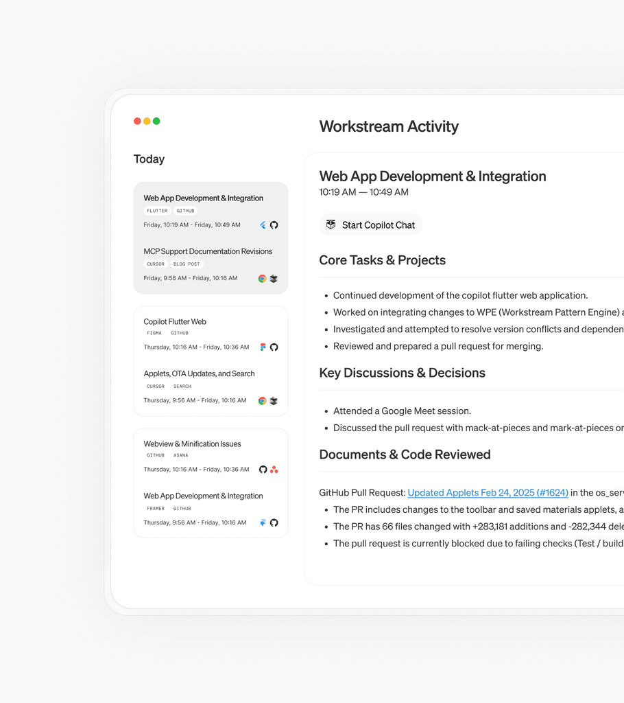 Developers bounce between tabs, terminals, meetings, and repos. When they return to a task – even hours later – they spend precious time reconstructing context. This project had the goal to turn any activity into a clear, trustworthy summary with next steps and resurface it at the right moments so devs can pick up work in seconds, not minutes.